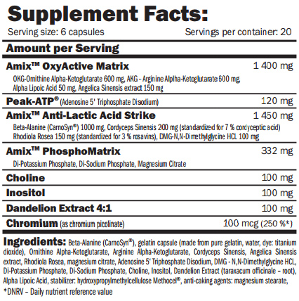 AMIXEPO-CORE™ VO2MaxFormula είναι μια ισχυρή προ-προπονητική φόρμουλα χωρίς καφεΐνη. Μοναδικό σύμπλεγμα υψηλής ποιότητας θρεπτικών ουσιών OKG, AKG, Peak-ATP®, CarnoSyn®, Φωσφορικά, Cordyceps, DMG, Χολίνη, Inositol, Πικραλίδα, Chromium, Rhodiolaκαι Angelica.
