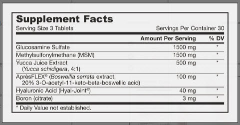 γλυκοζαμίνη, αιθυλοσουλφονυλομεθάνιο, εκχύλισμα yucca, εκχύλισμα bosvelli, υαλουρονικό οξύ, βόριο