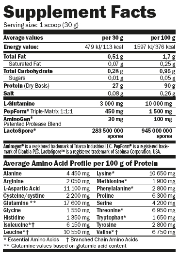 Περιέχει CFM Άμεση χρήση πρωτεΐνης ορρού γάλακτος με πρωτεϊνικά κλάσματα. Περιλαμβάνει υψηλές δόσεις L-γλουταμίνης, Aminogen®, Lactospore ™ και τριπλής μήτρας PepForm ™. Διεγείρει την ανάπτυξη της μυϊκής μάζας, προστατεύει τους μυς. Βελτιώνει την πέψη, την υγεία της εντερικής χλωρίδας και του ανοσοποιητικού συστήματος.