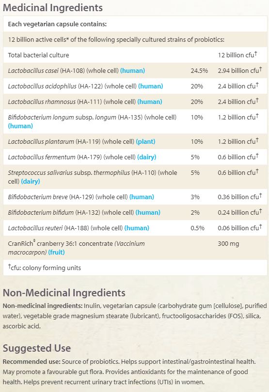 Συστατικά: Lactobacillus casei, Lactobacillus acidophilus, Lactobacillus rhamnosus, Bifidobacterium longum, Lactobacillus plantarum, Lactobacillus fermentum, Ekstrakt από φρούτα του βακκίνιο