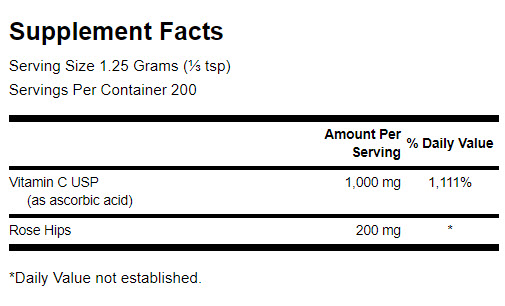 Η προσθήκη rosehips (καρπών αγριοτριανταφυλλιάς) ενισχύει περαιτέρω τη δράση της βιταμίνης C, καθώς οι καρποί αυτοί είναι πλούσιοι σε φυσικά βιοφλαβονοειδή και φυτοθρεπτικά συστατικά. Αυτή η συνέργεια ενισχύει την απορρόφηση και την αποτελεσματικότητα της βιταμίνης C, ενώ ταυτόχρονα προσφέρει επιπλέον αντιοξειδωτική προστασία. Με το Vitamin C with Rosehips Powder, η SWANSON εξασφαλίζει ένα αξιόπιστο και φυσικό συμπλήρωμα για την καθημερινή ενίσχυση της υγείας.