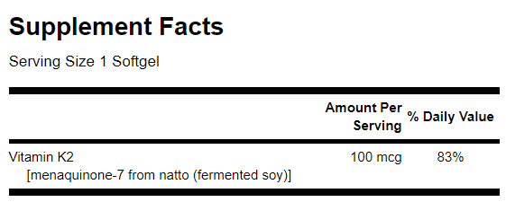 Σας παρουσιάζουμε ένα προϊόν που περιέχει βιταμίνη K-2 διπλής αντοχής, παρέχοντας 100 μικρογραμμάρια του συστατικού.