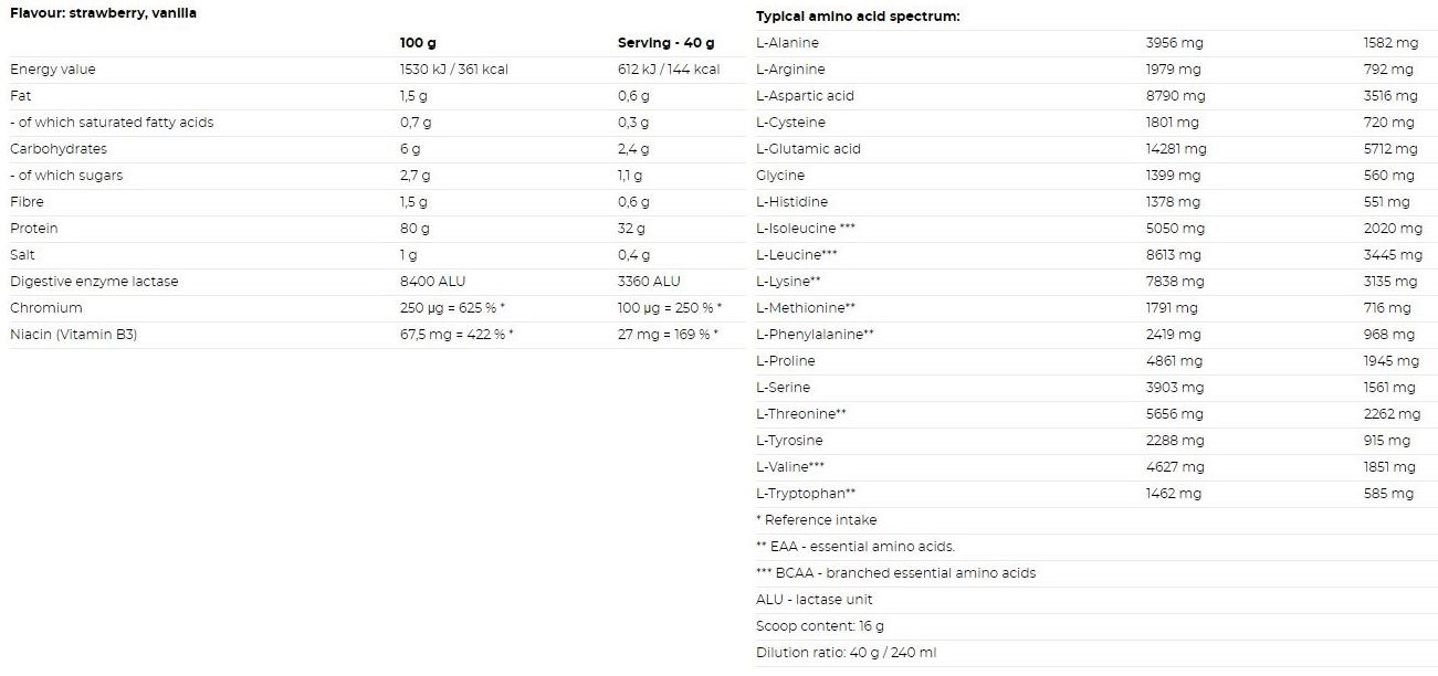 90% υδρολυμένος απομονωμένος πρωτεΐνης ορού γάλακτος (περιέχει λεκιθίνη σόγιας), κακάο, ίνες σίτου (χωρίς γλουτένη), αρωματικές ύλες, σταθεροποιητές (κόμμι ακακίας, ξανθάνη), αντισυσσωματικά (φωσφορικό ασβέστιο, διοξείδιο του πυριτίου), γαλακτικό χρώμιο, χλωριούχο νάτριο, πεπτικό ένζυμο λακτάση Tolerase™L, νικοτιναμίδιο, γλυκαντικά (σουκραλόζη και γλυκοζίτες στεβιόλης).