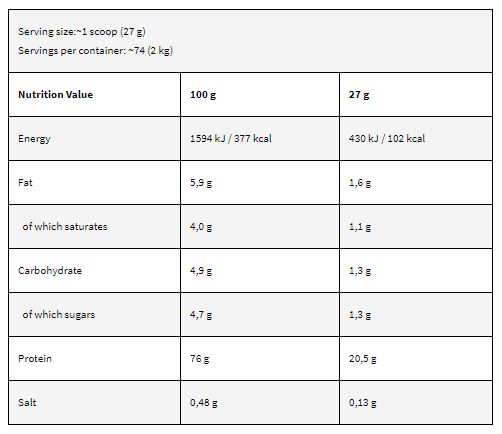 Πρωτεϊνικό μείγμα [συμπύκνωμα πρωτεΐνης ορού γάλακτος WPC80, πρωτεΐνη ορού «Isolac» (περιέχει λεκιθίνη σόγιας), υδρολυμένη πρωτεΐνη ορού «Optipep» 80, υδρολυμένη καζεΐνη, συμπύκνωμα λευκού αυγού], πηκτικός παράγοντας (ξανθανικό κόμμι), αντισυσσωματικό (E551), γλυκαντικό (σουκραλόζη), αρωματικές ύλες, χρώμα (E160a).