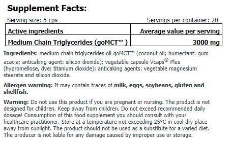 Συστατικά: έλαιο τριγλυκεριδίων μέσης αλυσίδας goMCT ™ (λάδι καρύδας, ρητίνη ακακίας · αντι-συσσωμάτωση: διοξείδιο του πυριτίου); φυτικό καψάκιο Vcaps® Plus (υπρομελλόζη, βαφή: διοξείδιο του τιτανίου); παράγοντες κατά της συσσωμάτωσης: φυτικό στεατικό μαγνήσιο και διοξείδιο του πυριτίου