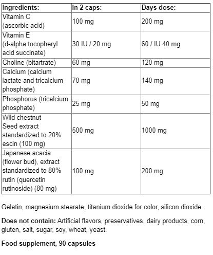 Επιπλέον, το εκχύλισμα σπόρων ιπποκαστανιάς, τυποποιημένο σε 20% αεσκίνη, είναι γνωστό για την υποστήριξη της φλεβικής υγείας και τη μείωση της αίσθησης βάρους στα πόδια. Το εκχύλισμα ανθών ιαπωνικής σοφόρας, τυποποιημένο σε 80% ρουτίνη (κερκετίνη ρουτινοσίδη), συμβάλλει στην ενίσχυση των τριχοειδών αγγείων και στη βελτίωση της μικροκυκλοφορίας.