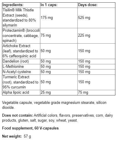 Το κύριο δραστικό συστατικό του Super Thisilyn είναι το εκχύλισμα γαϊδουράγκαθου, τυποποιημένο σε 80% σιλυμαρίνη (140 mg ανά μερίδα), γνωστό για τις ηπατοπροστατευτικές του ιδιότητες. Η σιλυμαρίνη δρα ως ισχυρό αντιοξειδωτικό, προστατεύοντας το ήπαρ από τις ελεύθερες ρίζες και υποστηρίζοντας την αναγέννηση των ηπατικών κυττάρων. Επιπλέον, το εκχύλισμα αγκινάρας (τυποποιημένο σε 7% καφεοϋλοκινικά οξέα) και η πικραλίδα συμβάλλουν στην παραγωγή και έκκριση χολής, διευκολύνοντας την πέψη και την απομάκρυνση των τοξινών από το σώμα. Το προϊόν περιέχει επίσης L-μεθειονίνη, N-ακετυλοκυστεΐνη, κουρκουμά (τυποποιημένο σε 95% κουρκουμινοειδή) και άλφα-λιποϊκό οξύ, τα οποία ενισχύουν την αποτοξινωτική ικανότητα του ήπατος και προστατεύουν από οξειδωτικές βλάβες.