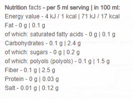 Συστατικά: νερό, πυκνωτικά - κόμμι κυτταρίνης, κόμμι ξανθάνης; ινουλίνη, γλυκαντικά - ξυλιτόλη, σουκραλόζη αρωματικές ύλες, χρώμα: καροτίνες; συμπύκνωμα μαύρου καρότου, συντηρητικά - σορβικό κάλιο, βενζοϊκό νάτριο. ρυθμιστής οξύτητας - κιτρικό οξύ.