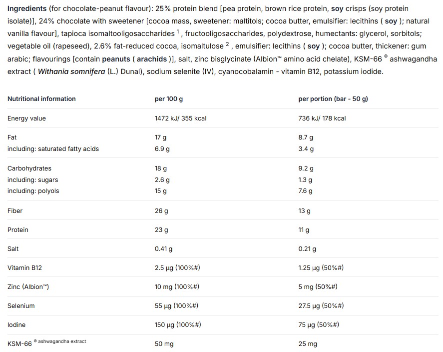 Συστατικά: 32,1% μείγμα πρωτεΐνης (προϊόν απομόνωσης πρωτεΐνης μπιζελιού, συμπύκνωμα πρωτεΐνης λευκού ρυζιού), φρουκτοολιγοσακχαρίτες, ισομαλτολιγοσακχαρίτης *, επίστρωση 13,4% με σοκολάτα με γλυκαντικό (γλυκαντικό - μαλτιτόλες · φυτικά λίπη (φοίνικας, πυρήνας φοίνικα, shea), λίπος - μειωμένο κακάο (βούτυρο κακάο 13%), γαλακτωματοποιητής - λεκιθίνες (ηλίανθος)), κραμβέλαιο, γαλακτωματοποιητής - λεκιθίνες 3,4% μπισκότα κακάο με γλυκαντικό (αλεύρι ρυζιού, γλυκαντικό - μαλτιτόλες · άμυλο αραβοσίτου, λιπαρό φοίνικα, κακάο, αλεύρι αραβοσίτου, ινουλίνη, ηλιέλαιο, παράγοντας αύξησης - ανθρακικά νάτριο · πυκνωτικό - κόμμι ξανθάνης, αλάτι, γαλακτωματοποιητής - λεκιθίνες (ηλίανθος αρωματικό), υγραντικό - γλυκερόλη. αρωματικά, πυκνωτικά - καρβοξυ μεθυλοκυτταρίνη. αντιοξειδωτικό - πλούσιο σε τοκοφερόλη εκχύλισμα γλυκαντικό - γλυκοζίτες στεβιόλης. Το προϊόν μπορεί επίσης να περιέχει σπόρους NUTS, PEANUTS και SESAME.