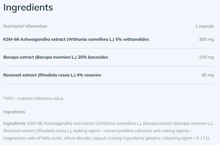 KSM-66 εκχύλισμα ρίζας Ashwagandha (Withania somnifera L.), εκχύλισμα Bacopa (Bacopa monnieri L.), εκχύλισμα Rhodiola rosea (Rhodiola rosea L.), μικροκρυσταλλική κυτταρίνη (πλήρωση), μαγνησιούχα άλατα λιπαρών οξέων και διοξείδιο του πυριτίου (αντιπηκτικά), κάψουλα (ζελατίνη, χρωστική E 171).