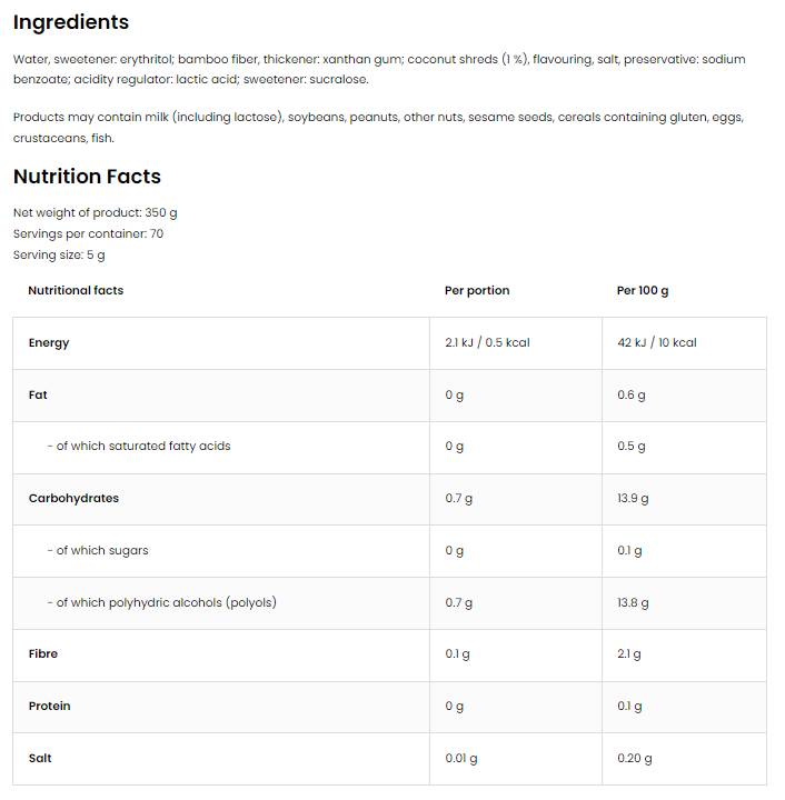 Ιδιότητες του OSTROVIT PHARMA Coconut Flavored Sauce | Vegan Friendly - Zero Calorie / 350 ml: