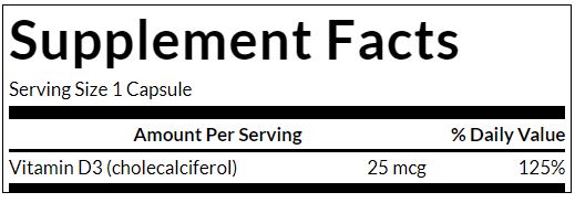 Η βιταμίνη D3 της Swanson είναι μια απαραίτητη βιταμίνη για την υποστήριξη των οστών που λειτουργεί για να απορροφά αποτελεσματικά το ασβέστιο από το σώμα. Το σώμα παράγει μόνο του κάποια βιταμίνη D όταν εκτίθεται στο ηλιακό φως, αλλά για τους ανθρώπους που ζουν στα βόρεια γεωγραφικά πλάτη όπου η έκθεση στον ήλιο το χειμώνα είναι περιορισμένη, η φυσική βιταμίνη D του σώματος μπορεί συχνά να είναι ανεπαρκής. Οι κάψουλες υψηλής δραστικότητας βιταμίνης D3 αντιμετωπίζουν αυτό το πρόβλημα παρέχοντας εντυπωσιακά 1.000 IU βιταμίνης D3, το πιο βιολογικά ενεργό κλάσμα βιταμίνης D.