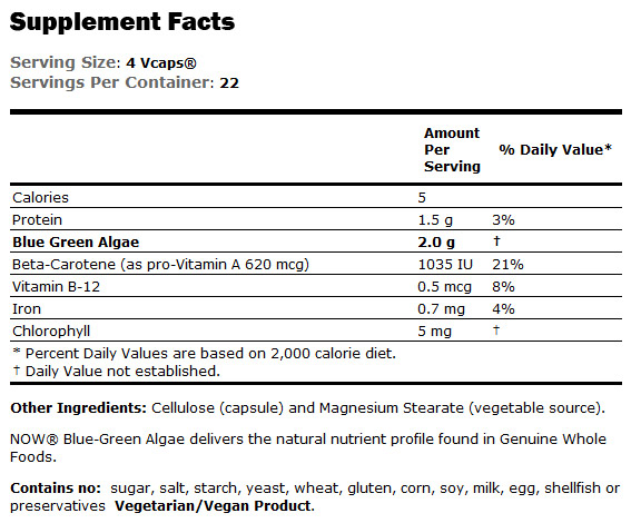 Το BlueGreen Algae 500mg 90 VCaps της NOW είναι ένα 100% φυσικό συμπλήρωμα διατροφής που περιέχει μπλε πράσινα φύκια (Aphanizomenon flos aquae).Τα μπλε πράσινα φύκια έιναι ένα μοναδικό superfood που συλλέγονται από την παρθένα περιοχή της Άνω Klamath λίμνη στο όρη Cascade στην Όρεγκον(ΗΠΑ). Αυτά τα πλούσια σε θρεπτικά συστατικά φύκια, ξηραίνονται και το συμπύκνωμα απο το φυσικό πρώτων υλικό τους περιέχει ένα πλήρες εύπεπτο φάσμα εξαιρετικά πλούσιο σε μέταλλα, βιταμίνες, πρωτεΐνες και χλωροφύλλη.