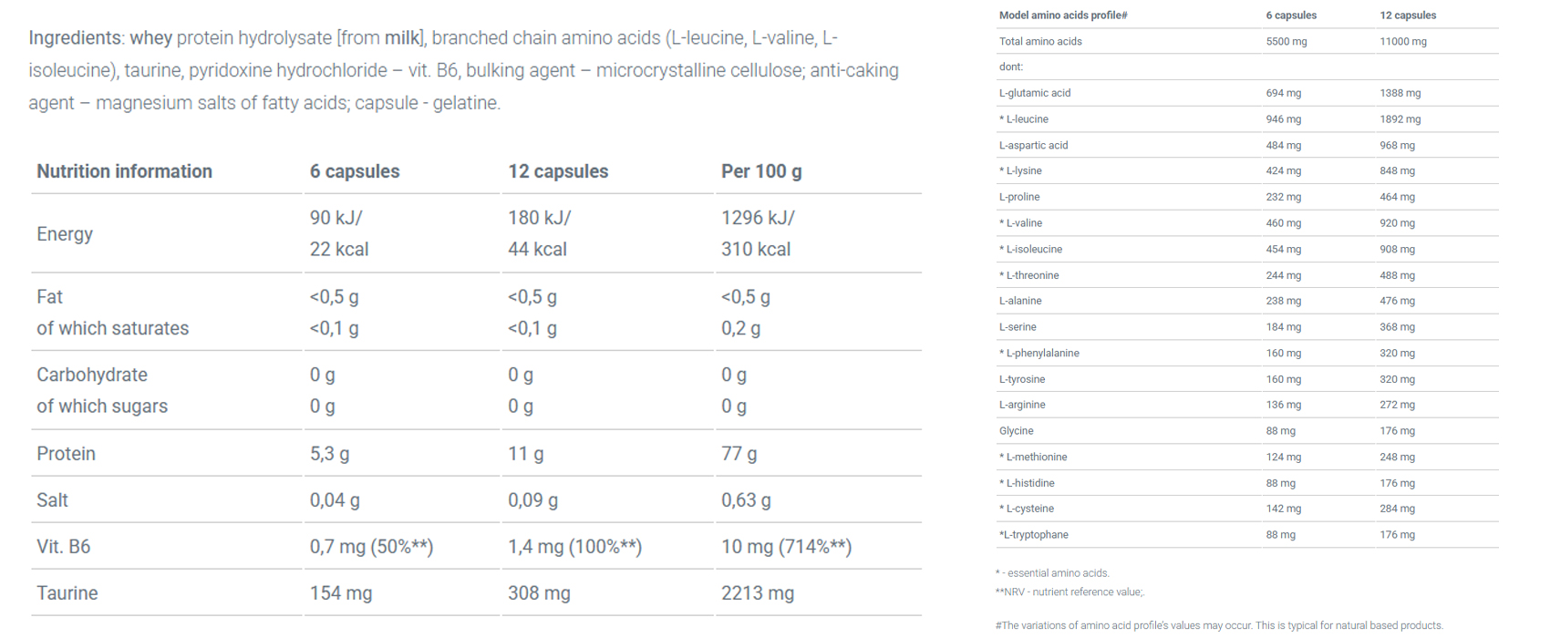 Το Anabolic Amino 5500 Mega Caps περιέχει ένα ισορροπημένο μείγμα L-λευκίνης, L-ισολευκίνης, L-βαλίνης (BCAA), γλουταμίνης και υδρολυμένων πρωτεϊνών ορού γάλακτος. Τα BCAA παίζουν καθοριστικό ρόλο στη μυϊκή πρωτεϊνοσύνθεση και στην πρόληψη του καταβολισμού, ενώ η γλουταμίνη ενισχύει την ανάρρωση και τη λειτουργία του ανοσοποιητικού συστήματος. Τα υδρολυμένα πεπτίδια απορροφώνται άμεσα, προσφέροντας ταχεία παροχή θρεπτικών ουσιών στους μυς μετά την άσκηση.