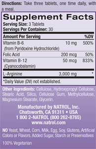 Το Natrol® L-Arginine είναι ένα συμπλήρωμα διατροφής που περιέχει L-αργινίνη και βιταμίνες του συμπλέγματος Β (Β6, Β12 και φολικό οξύ), σχεδιασμένο για να βελτιώνει τη σεξουαλική και αγγειακή υγεία. Το Natrol® L-Arginine είναι απαραίτητο για την παραγωγή του μονοξειδίου του αζώτου, ενός μορίου σηματοδότησης που απαιτείται για μια ποικιλία σωματικών διεργασιών και λειτουργιών, συμπεριλαμβανομένης της ρύθμισης της ροής του αίματος, της μιτοχονδριακής λειτουργίας και της κυτταρικής επικοινωνίας.