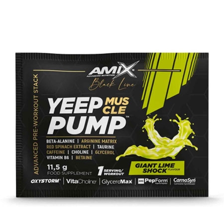 Το δραστικό μείγμα του AMIX Black Line Yeep Pump Sachets περιλαμβάνει L-κιτρουλίνη και L-αργινίνη, αμινοξέα που ενισχύουν την παραγωγή νιτρικού οξειδίου (ΝΟ), προάγοντας καλύτερη αγγειοδιαστολή και μυϊκό όγκο κατά την άσκηση. Η βήτα-αλανίνη συμβάλλει στη μείωση της μυϊκής κόπωσης και επιτρέπει παρατεταμένη απόδοση σε υψηλής έντασης προπονήσεις. Η καφεΐνη και άλλα διεγερτικά συστατικά παρέχουν εκρηκτική ενέργεια και πνευματική εγρήγορση, ενώ τα επιλεγμένα εκχυλίσματα και ηλεκτρολύτες βοηθούν στη διατήρηση της ισορροπίας υγρών και στη μείωση της κούρασης.