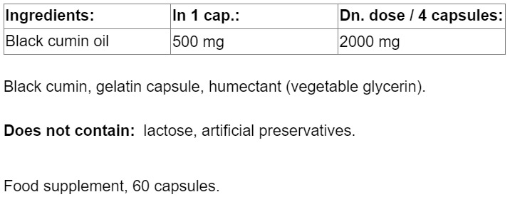 Αυτό το προϊόν συνδυάζει τις ευεργετικές ιδιότητες του μαυροκύμινου με τη μορφή εύκολης στην κατανάλωση κάψουλας, για άνεση και ευκολία στην καθημερινή του χρήση. Κάθε συσκευασία περιέχει 60 κάψουλες, για περίπου 1-2 μήνες χρήσης, ανάλογα με τη δοσολογία.