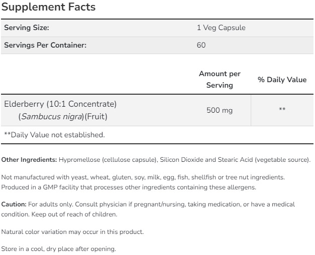 Το Elderberry500 mgπεριέχει συμπυκνωμένο εκχύλισμα από μαύρο σαμπούκο (Sambucusnigra), πλούσιο σε φλαβονοειδή, ανθοκυανίνες και άλλα βιοδραστικά συστατικά, γνωστά για την ευεργετική τους επίδραση στο ανοσοποιητικό. Οι αντιοξειδωτικές του ιδιότητες συμβάλλουν στην προστασία των κυττάρων από το οξειδωτικό στρες και υποστηρίζουν την φυσική ανοσολογική απόκριση κατά τη διάρκεια των εποχικών προκλήσεων.