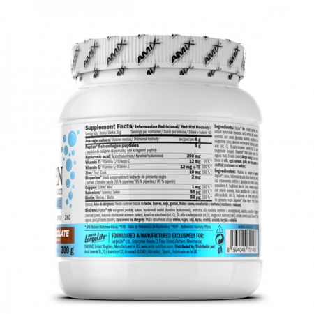 Peptan® θαλάσσιο κολλαγόνο, υαλουρονικό οξύ, βιταμίνη C, βιταμίνη E, ψευδάργυρος, Bioperine® (εκχύλισμα μαύρου πιπεριού), χαλκός, σελήνιο, βιοτίνη.