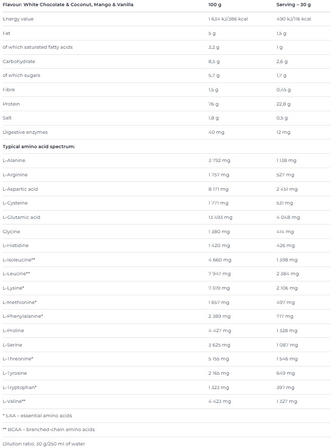 Η βάση του προϊόντος είναι συμπύκνωμα πρωτεΐνης ορού γάλακτος και CFM απομονωμένη πρωτεΐνη, η οποία διεγείρει τις αναβολικές διαδικασίες και απορροφάται εύκολα από το σώμα. Η φόρμουλα είναι εμπλουτισμένη με αμινοξέα, τα οποία απορροφώνται άμεσα ως τροφή για τον μυϊκό ιστό.