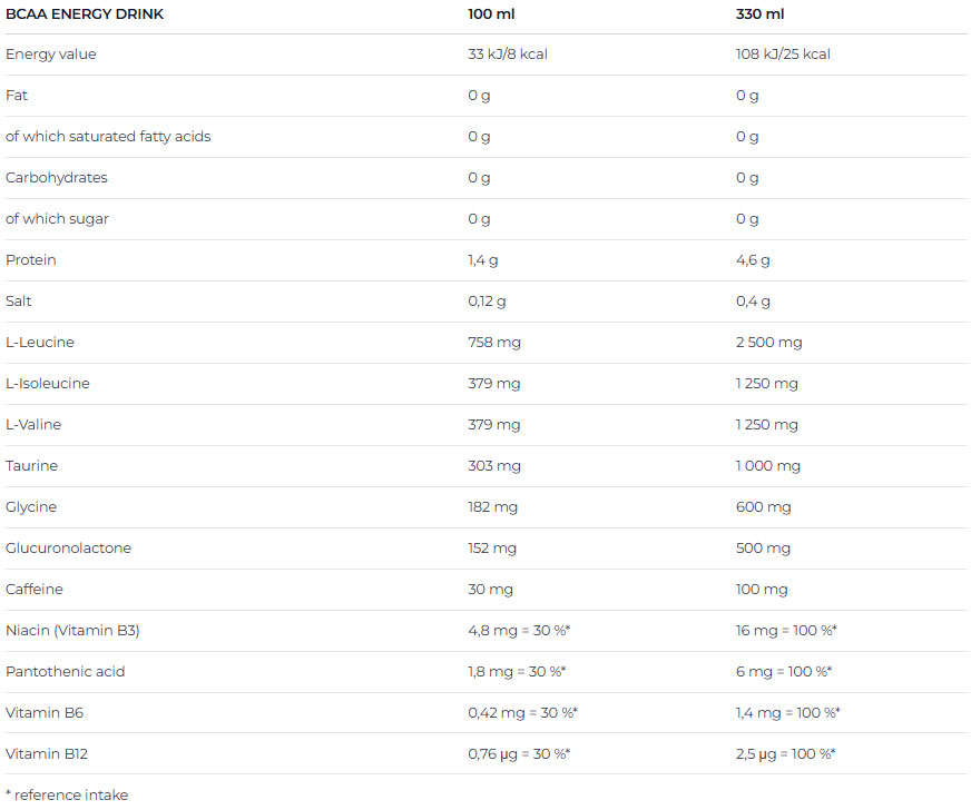 Το BCAA Energy Drink / 330 ml περιέχει διακλαδισμένα αμινοξέα (L-λευκίνη, L-ισολευκίνη, L-βαλίνη) σε αναλογία 2:1:1, τα οποία είναι απαραίτητα για τη διατήρηση και αύξηση της μυϊκής μάζας. Επιπλέον, περιέχει καφεΐνη και ταυρίνη, που τονώνουν την ενέργεια και αυξάνουν την πνευματική εγρήγορση, ενώ η βιταμίνη B6 συμβάλλει στη μείωση της κόπωσης και στη φυσιολογική λειτουργία του μεταβολισμού.