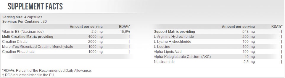 Περιέχει τέσσερις διαφορετικούς τύπους κρεατίνης για να επιτύχει την μέγιστη αποτελεσματικότητα