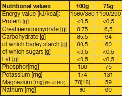 VITARGO, είναι εμπλουτισμένη με καθαρή μονοϋδρική κρεατίνη - ένα από τα πιο αποτελεσματικά αμινοξέα που βοηθά την αύξηση της μυϊκής μάζας. Η κρεατίνη βοηθά την αύξηση της μυϊκής μάζας, την εξάλειψη του γαλακτικού οξέος και αφαιρεί την αίσθηση της δυσκαμψίας μετά από την έντονη προπόνηση. Η κρεατίνη ρυθμίζει την ισορροπία αζώτου στο σώμα, το οποίο άζωτο, επίσης αυξάνει τον όγκο των μυών και αποτρέπει την εμφάνιση πόνου στους μυς μετά από την έντονη προπόνηση, γεγονός που επιταχύνει την αποκατάσταση του σώματος. Επιπλέον, η κρεατίνη αυξάνει την παραγωγή της αυξητικής ορμόνης και διεγείρει την έκκριση ινσουλίνης.