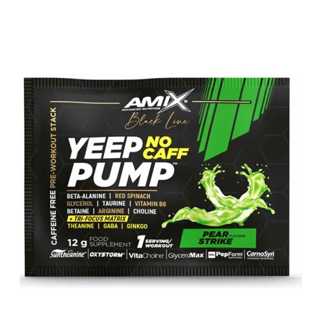 Το Amix Yeep Pump NO Caff είναι μια επαναστατική υπερσυμπυκνωμένη στοίβα πριν την προπόνηση σχεδιασμένη για τους πιο απαιτητικούς αθλητές να προχωρήσουν τις εντατικές προπονήσεις τους στο επόμενο επίπεδο. Αυτό το δροσιστικό και γευστικό ρόφημα βασίζεται σε δόση 3 g CarnoSyn® Beta-alanine με έγχυμα Arginine Matrix, Tri-Focus Matrix, Taurine, L-Lysine, Glycerine GlyceroMaxTM, VitaCholine®, εκχύλισμα κόκκινου σπανακιού Oxystorm® και Betaine. Η βιταμίνη Β6 βοηθά στη μείωση της κούρασης και της κόπωσης. Το Ginkgo Biloba είναι ένα ισχυρό αντιοξειδωτικό και υποστηρίζει τη μικροκυκλοφορία του συστήματος του αίματος.