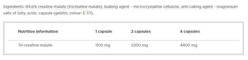 Συστατικά: 95% creatine malate (tricreatine malate), bulking agent - microcrystalline cellulose, anti-caking agent - Magnesium stearate, capsule (gelatin, colours: E171, E172, E104, E127).