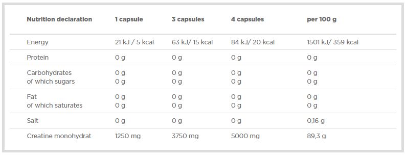 Μονοϋδρική κρεατίνη των 1250 mg. Το προϊόν προσφέρει την υψηλότερη περιεκτικότητα σε κρεατίνη σε 1 κάψουλα. Στους μυς, η κρεατίνη δεσμεύεται με φωσφορική κρεατίνη από την οποία παράγεται ATP (τριφωσφορική αδενοσίνη).
