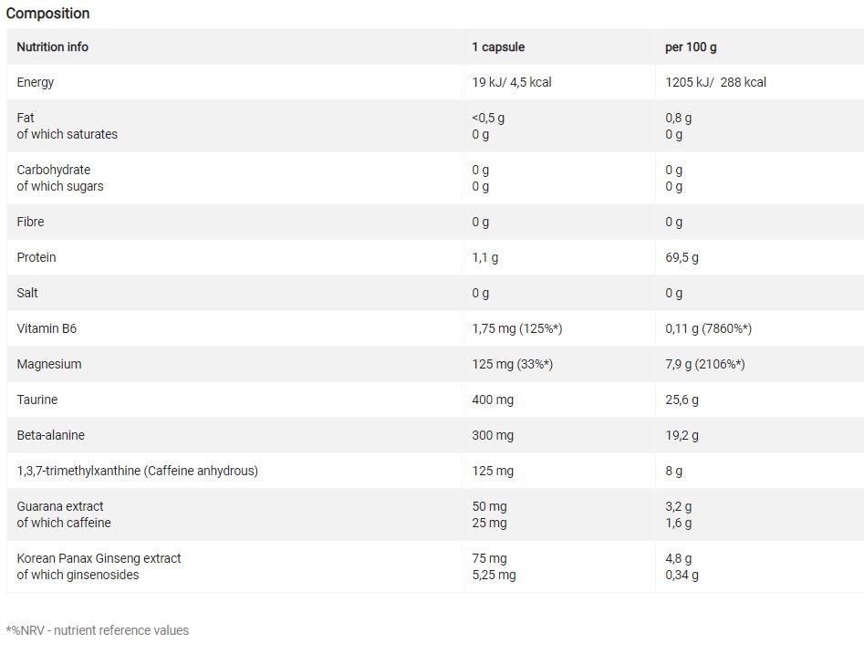 Συνιστώμενη ημερήσια πρόσληψη: Πάρτε 1-2 κάψουλες πριν από την προπόνηση.