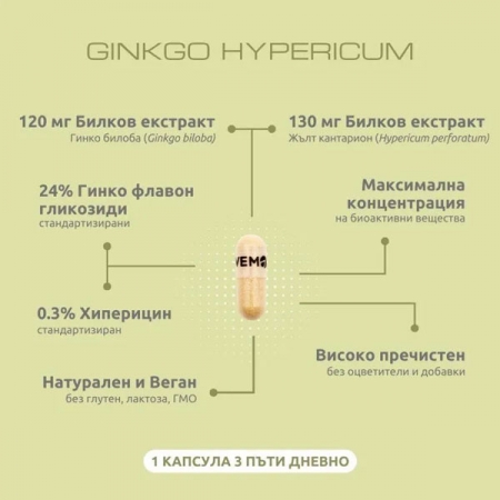 Το VemoHerb® Ginkgo Hypericum περιλαμβάνει στην ειδική φόρμουλα τυποποιημένα ξηρά εκχυλίσματα από τα φύλλα του Ginkgo biloba (Ginkgo biloba) και πάνω από τη μάζα Hypericum perforatum (St. John's wort) με υψηλή περιεκτικότητα σε ενεργά συστατικά. Η επιλεγμένη αναλογία είναι σύμφωνη με την ποσότητα της υπερκικίνης - 0,3% στο εκχύλισμα και την ποσότητα των γλυκοσίδων του ginkgo flavone - 24%, υπολογιζόμενη ως το άθροισμα της κουερσετίνης, της καμπεφερόλης και της ισοραμετίνης.